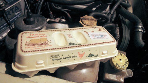 Abból indultam ki, hogy ahhoz, hogy működjön a dolog, a tojásnak meg kell főnie, így csurig töltöttem a rendszert vízzel, majd járattam kicsit a motort, hadd melegedjen meg a víz. Aztán beleütöttem egy tojást a kiegyenlítő tartályba. A tojás azonnal eltűnt. Biztos, ami biztos alapon utána küldtem még egyet. A víz továbbra is csöpögött a hűtőből, de a tartályban alig süllyedt a szint. Hoppá! Ezek szerint működik? Tudja fene, lehet, hogy csak a termosztát nem nyílt ki, hiszen hideg vizet öntöttem a rendszerbe (nagyon óvatosan, apránként töltögettem, nehogy a hősokktól szétrepedjen a blokk vagy a hengerfej). De most már kezdett melegedni, a tartályból is gőz szállt fel, még egy tojást beleütöttem a vízbe, rácsavartam a fedelet, és elindultam.