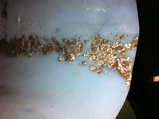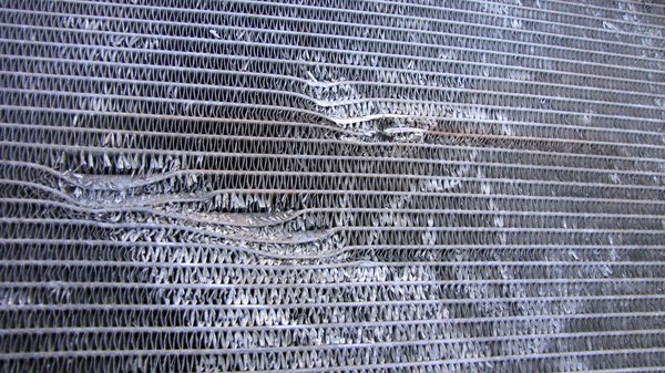 A kukaérett hűtőt a legnagyobb sérülés mellett kettévágtam. Sajnos a flex elég sorjásan vágja az alumíniumot, de kicsit szétfeszítve a járatokat azonnal láthatóvá válik, hogy az ép vízjáratokban szinte semmi nem látszik a tojásdarabkákból. De ott, ahol a lyukon keresztül kiszivárgott a lé, vitte magával a tojás-részecskéket is. Amik között voltak nagyobbak is, és megakadtak a résben. Aztán ebben megakadtak a többiek, szépen, egymás után. És a végén betömték a lyukat. Ügyes.