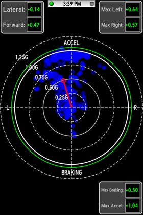 Utóbbi funkció tök egyszerű, de már önmagában is jelzi, hogy valaki gondolkodott. Hasonló felhasználásra jó a kétdimenziós gyorsulásérzékelő, amin láthatjuk, mennyire tapad a gumink, illetve milyen közel járunk a határokhoz pályaautózásnál. És a felvett adatokat színes kukacként még rá is tudja kanyarítani a bejárt nyomvonalra – zseniális. Off-roadosoknak pedig a dőlésmérő segít eldönteni, most fognak-e felborulni a triálon vagy csak a következő kanyarban.