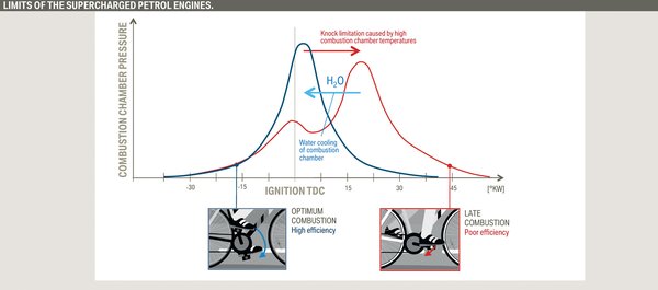 A vízbefecskendezés ilyenkor jön jól, ahogy például a MOTOGP-ben futó BMW M4-es Safety Carnál alkalmazták. Ennél még azt a hagyományos módszert követték, amit mindenki más korábban: a vizet a szívócsőbe fecskendezik. Az új technika, a közvetlen befecskendezés ennél rafináltabb: itt az égéstérbe megy a víz, aminek határozott előnye, hogy körülbelül tizedannyi vízre van szükség, miközben a csúcsnyomaték 5-10 százalékkal is növelhető.
