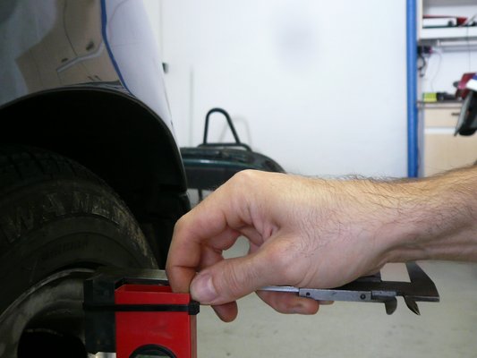 Kettes számú háztáji műszerem egy akciós vízmérték, amelyre rákötegelőztem a két kihúzott végdarabját, így hozzá tudom állítani a felnimérethez. Biztos pontra kell támasztani, hogy alul és felül ugyanoda feküdjön fel, majd a tetejét elhúzva a buborék segítségével megkeresni a függőlegest. Ha nem akarunk közben fényképezni, viszonylag könnyű sublerrel (akinek nincs, használhat tolómérőt is) megmérni a különbséget, ha bizonytalanok vagyunk, kikereshetjük a krovakészletből a hézagba éppen illeszkedő dugókulcsot, és annak mérjük meg a külső átmérőjét. Innentől megint csak egy koszinusz választ el a fokban mért értéktől: a Mareánál koppra bedöntve 2,5 fok lett, amit utcára már nem ajánlanék, pályázni viszont még kicsit kevés, főleg a mi karosszériadőlésünkkel, de ennyit adott ki a geometria.