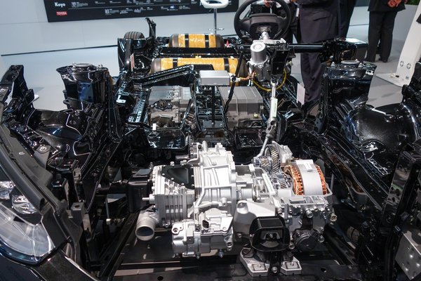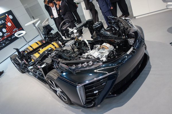 A Mirai egyébként egy semmi. Az orra szinte üres. Valahol az aljában darvadozik egy apró hajtáslánc, tényleg akkora, amekkora a kétütemű Trabant orrában van. Ez viszi? Itt szunnyad 136 lóerő? Szinte hihetetlen. És még a tüzelőanyagcella kompresszora is ebben a dobozban lakik, s szinte az a legnagyobb egység a hajtásban. A kocsit egyébként a Jtekt nevű beszállító állította ki, ők szállítják a különféle szelepeket, egyéb izébizéket bele.