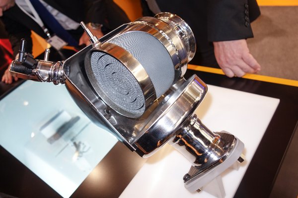 Nini, mi ez a krómozott csigaszivacs? Újfajta tengeri létforma? Dehogy, így néz ki az AdBlue szűrő belülről – tudják, a modern dízelek kipufogógáz-takarító berendezése. A vastag csövön jön be a kipufogógáz, átmegy a rostokon, a spricni bal fent pedig az AdBlue-adalék, magyarán pisi-spriccelő szelepe. A Continental nem is szemérmeskedik, eleve azt írja a modell mellé magyarázatul: Urea Filter, azaz karbamid-szűrő, kis csúsztatással pisiszűrő. Értik, nem AdBlue, a beszállítók nem marketingnyelven beszélnek, az odébb jön a gyártásláncban.