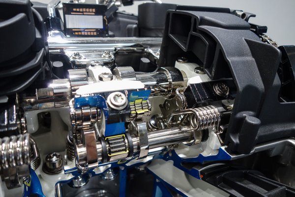 Egy másik modellen, amely csak a Schaeffler által szállított elemeket mutatja be fémi valójukban, a motor többi részét jellegtelen plexi formákként, megtekinthető, hogyan működik a vezérműtengely-eltolós változó szelepvezérléses/hengerleállítós mechanika (mert mindkettőre jó). Nézzék csak azt az íves pályát és az ujjas működtetőt!