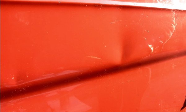 De ott van a tűzoltó Transit esete, ami még látványosabbra sikerült, mint a Mitsubishi: nagy horpadást húztam ki, és sajnos festéket is téptem le az ajtóról. Hogy pontosan mi okozta a festékleválást, csak tippelni tudok. Lehet, hogy a gyárban felvitt piros festék nem tapadt eléggé az alapozó fehér réteghez – ezt azért nehezen tusom elképzelni, de előfordulhat. Hihetőbbnek tűnik, hogy a leválasztószer, ami egy acetonbázisú folyadék, egyszerűen reakcióba lépett a harmincéves festékkel, és ezért tudott darabokat kitépni belőle a ragasztó. A Transiton egyrétegű uni-bevonat van, a Sigmán lakkos metál, a lakk sokkal keményebb, ellenállóbb tud lenni a vegyszerekkel szemben. Azt hiszem, legközelebb megpróbálom a hagyományos fényezésen az elválasztó folyadék használatát kerülni, vagy valami alternatív megoldást találni.