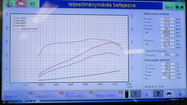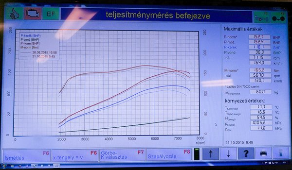 Most az első mérésnél 152,2, a másodiknál 152,7 lóerő jött ki, míg két hónappal ezelőtt, az összerakás után 142,4-et, illetve légszűrő nélkül 145,4-et mértünk. Nem rossz egy gyáriag 147 lóerősnek mondott, 96-os Fiattól.