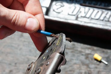 A művelet végtelenül egyszerű: megfelelő hosszon le kell blankolni a huzal végét, rátenni a kábelvéget és nyomni egy izmosat. Csak a csupaszítás hosszát kell jól eltalálni, no meg a színhelyes gödröt a fogó pofájában. A színkódok amúgy a vezeték keresztmetszetét jelölik, a piros 0,5-1 mm2-es, a kék 1,6-2,5 mm2-es, a sárga 4-6 mm2-es huzalhoz használható, ahogy a fogón is fel van tüntetve. Ennek becsléséhez kell némi tapasztalat, de alapvetően ami erőltetés nélkül belemegy a lyukba, az jó lesz.