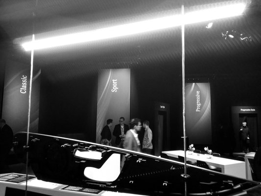 A Classic Style-on volt már? - kérdezi az egyik hostess csaj. Ööö, igen, válaszolom bizonytalanul, Bence, a magyar PR-es pedig önfeláldozó módon kiment valamivel, hiszen tudja, mennyire megviselt fél órával korábban a Sport Style. Ott ugyanis az történt, hogy egy magyar kollégával bementünk egy sötét szobába, ahol egy álcamatricás nagy Mercedes állt, E Klasse táblával a rendszámtábla helyén. Megkérdeztem, hogy akkor ez most ugye egy S osztályba épített E-belső, demózási céllal, de nem, ez egy kész E, csak még nem mutatták be, mert az Detroitra vár. Egy férfi az autón kívül, egy nő az utasülésen, lehetett kérdezni, de nem igazán tudtam mit. Oké, a sportos beltérváltozatban több a fémes felület, és a műszerfalat borító, valódi fémmel átszőtt anyag is érdekes, de itt vége a szellemi tűzijátéknak. Főleg, hogy azt a pár dolog, amit kérdeztem, a csaj nem tudta, és nem volt olyan rutinos, mint az általános projektmenedzser, aki az előtérben úgy oldotta meg a hasonló helyzeteket, hogy „nem tudom” helyett „jelen pillanatban erre a kérdésre még nem válaszolhatok”-ot mondott.