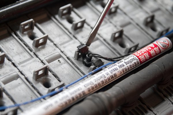 Annyira azért nem egyszerű, mondja Dodó, miközben felhúzza a vastag szigetelőkesztyűt. Kihúzza a biztosító kapcsot, amellyel le lehet választani az akkumulátort az elektronikáról, majd felbontja a fémdobozt. Huszonnyolc cella sorakozik egymás mellett, és a feszültségmérőn kijelzett kétszáz volt fölötti szám azt mondja, nem jó ötlet csak úgy nyúlkálni. Ha viszont tudja az ember, hogy kell nekilátni, csak csavarozgatni kell, és már szét is ugrik elemeire.