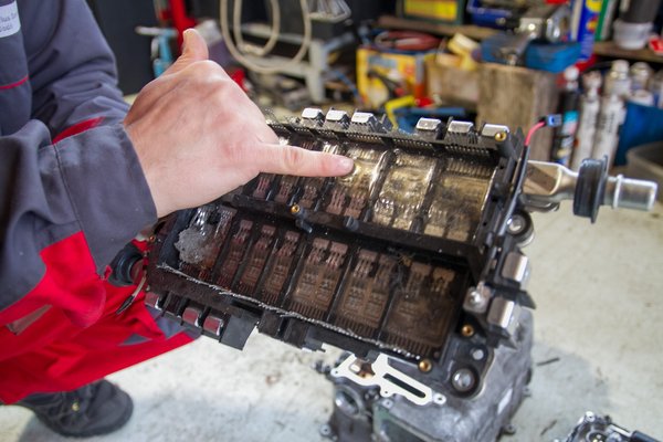 Zselészerű átlátszó masszával van kiöntve az inverter, szétszedés után látványos a hiba: ha az egyik elektronikai egység megég, a kocsonya elfüstöl. Javítani nem nagyon lehet, cserélni kell, és utána inkább kerülni a power módot. Az inverter az egyik legerősebb érv a kettes Prius mellett a hármassal szemben.