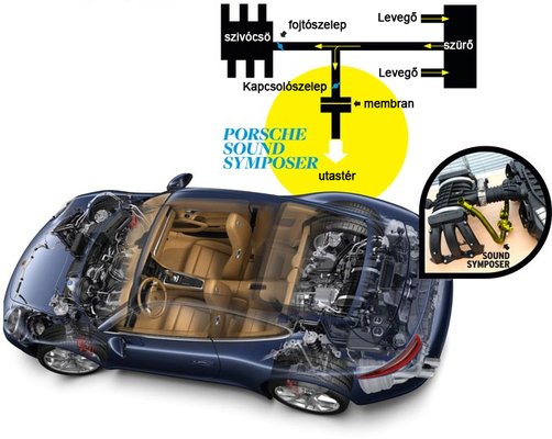 A farmotoros Porsche 911 esetében a szívócső egy akusztikailag hangolt szakasza a hátsó ülés mögé van vezetve. Ebbe a hangolt szakaszba membrán van építve, amely a szívócső-rezonancia hatására a szívóhangot erősíti. Ha sport módba kapcsolunk, vagy a kabrió esetében a tetőt leengedjük, ez a rész egy csappantyúval megnyílik, és erősebben halljuk a motorhangot. Mellesleg a kipufogóban is nyílik egy csappantyú, de ezt nem szabad túlzásba vinni, mert az autónak sport módban is tudni kell a környezetvédelmi normákat, így a zajkibocsátást is.
