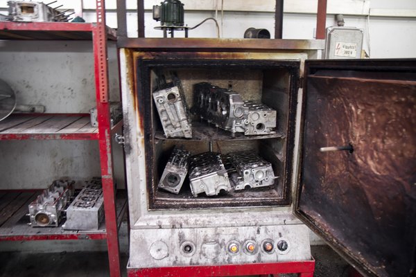 A bonyodalmak ott kezdődnek, amikor repedést fedeznek fel a hengerfejen. Szinte bárhol előfordulhat, a klasszikus gátrepedéstől – a szelepek között – a vezérműtengely felőli oldal rendellenes károsodásáig. Ilyenkor miszlikbe kell szedni a hengerfejet, hogy meg lehessen hegeszteni. Az előkészítés ránézésre hentesmunkának látszik, fúrással, faragással megy le a hegesztő a repedés tövéig, hogy aztán a kemencében előmelegített hengerfejben hegesztéssel feltöltse a hézagot.