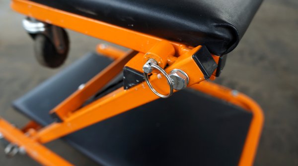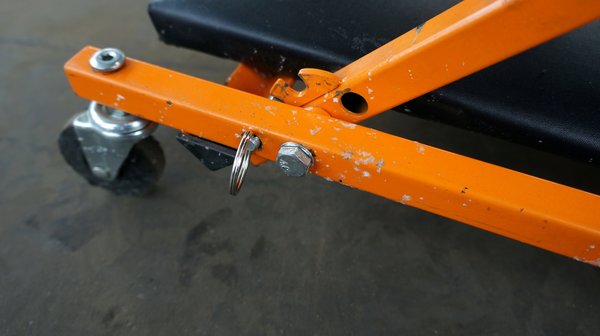 Ez a használt is finoman gurul teflonos csapágyain és gumikerekén, ráadásul az iránytartása is kiváló, a kárpitozása tartós, nem szakadt meg sehol, és könnyen is mosható. De a legnagyobb trükkje, hogy két helyen is ki lehet a keretből húzni egy sasszeg-párt, így egy mozdulattal kényelmes, háttámlás szék, illetve még eggyel később tökéletes sámli varázsolható belőle. Ilyenkor úgy néz ki, mint egy támadó kígyó, amelyik csak arra vár, hogy végre belemarhasson egy gépbe. És nem lóg, nem recseg, nem lötyög, egyszerűen csak bírja a nyúzást és kész.