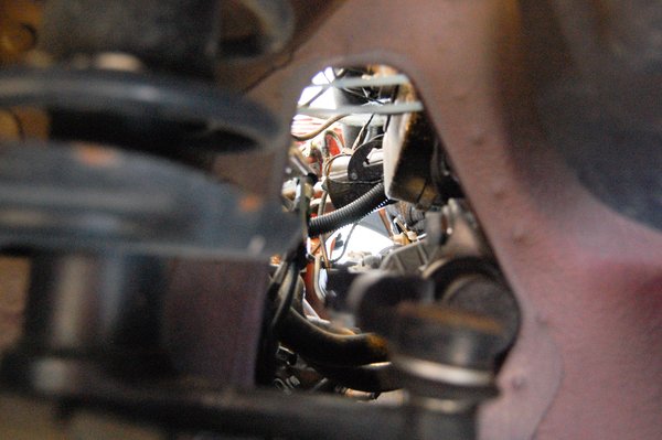Az sem kelti végtelen profizmus látszatát, hogy a doblemez kivágásában a toronycsapágy nem centrikusan helyezkedik el, hanem erősen hátra van tolva. Minta elfelejtettek volna utánfutást adni geometriailag, aztán Szása megoldotta: kicsit hátranyomta az egész gólyalábat a toronycsapággyal. Lett egy kis lyuk a gólyaláb előtt, de legalább itt is szellőzik a motortér.