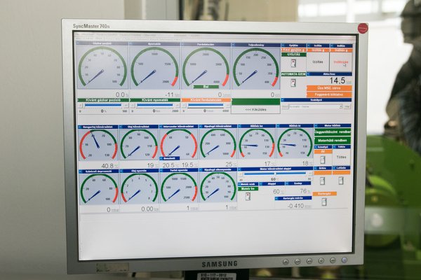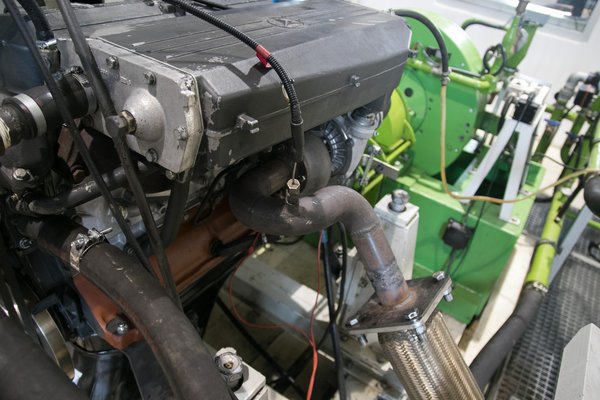 Amilyen motorok megfordulnak a műhelyben, azokhoz legyártják a méréshez szükséges elemeket, majd ha minden megvan és fel van szerelve, helyet lehet foglalni a mérőszobában, és pár kattintással indulhat a motor. Most éppen egy OM366-os, hathengeres Mercedes-motor van a padon, az első fordulatokat teszi meg a felújítás után. Nem egy bonyolult eset, soros adagolóján a gázkart kell húzogatni, a többi kábelezés többsége érzékelőkhöz vezet. Minden lényeges hőmérsékletet, a beszívott levegőtől a kipufogógázig, minden nyomást látni a monitoron, pár kattintással be lehet állítani a terhelést, a fordulatszámot, és már izzik is a turbó.