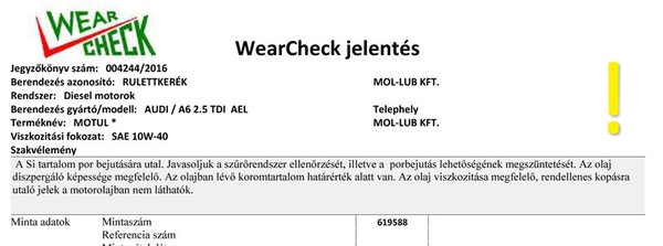 Kihasználtuk a Mol Lub Kft. mindenki számára elérhető szolgáltatását, amely minta alapján bevizsgálja az olajat. Kémiai elemeket és egyéb szennyeződéseket, valamint fizikai tulajdonságokat is néznek, például a viszkozitást. Mivel mi nem kértünk semmilyen speciális szakértői véleményt, a WearCheck-ben általánosságban kaptuk meg a kenőolaj tulajdonságait. Megtehettük volna, hogy konkrét dolgokat kérdezünk, például mikor lehetett az olajcsere, cseréltek-e mostanában olajat, vagy megfelelő olajat tettek-e bele. Nekünk ez nem volt érdekes, de másnak egyéb esetekben perdöntő lehet.