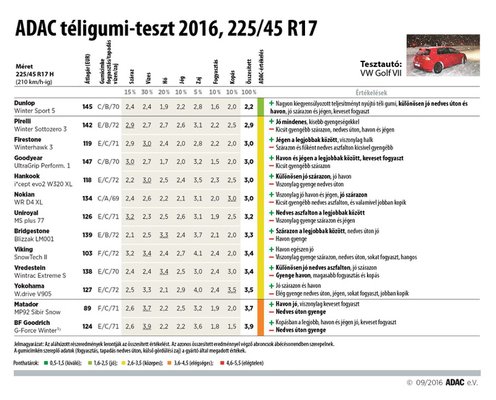 Magyarországon ugyan alapvetően nem kötelező a téli gumi használata, de nem kell ahhoz hó és jég, hogy már érzékelhető legyen a tapadásbeli különbség a nyári abroncsokhoz képest. Európa országaiban erre és a hóláncra is eltérő előírások vonatkoznak, ezeket a Katasztrófavédelem is összegyűjtötte. Azoknak, akik megvennék az évszaknak megfelelő gumikat, de nem tudnak eligazodni a kínálatban, évről évre mankót ad a német autóklub, vagyis az ADAC tesztje. Idén két szegmensből válogattak: a kisautóknál és kompaktoknál gyakori 185/65 R15-ös méretben tizenöt, a középkategóriában elterjedt 225/45 R17-es méretben tizenhárom gyártó termékeit vizsgálták. Kipróbáltak továbbá hétféle négyévszakost is.