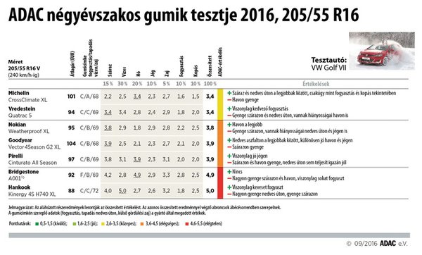 A két legjobb négyévszakos, a Michelin CrossClimate XL és a Vredestein Quatrac 5 egyaránt csak közepes összértékelést kapott, míg a Nokian, a Goodyear és a Pirelli elégségessel zárt. Teljesen elhasalt viszont a teszten a Bridgestone A001-ese, amely szárazon és havon is gyengén szerepelt, valamint a nedves úton rosszul teljesítő Hankook Kinergy 4S H740 XL is. Utóbbi ugyanakkor nagyon kedvező fogyasztást produkált.