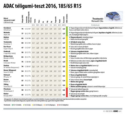 Idén tizenöt különböző gumit teszteltek, ezeket egy Renault Clióra szerelték fel. Ezek közül azonban csupán két abroncs kapott jó minősítést: a tesztgyőztes a Goodyear UltraGrip 9 mintázata lett a maga 2,2-es összesített osztályzatával, egy tizeddel megelőzve a Michelin Alpin A4-et. (Itt a pontozás kicsit megnehezíti felfogni a számokat, az 0,5 a legjobb, az öt és fél a legrosszabb osztályzat). Az ADAC csak a minden felületen kiegyensúlyozottan teljesítő gumiknak ítél oda ilyen magas osztályzatot, ugyanakkor itt is megfigyelhető, hogy más-más területen teljesítettek jobban a gumik. Míg a Goodyear havon és fogyasztásban volt kiemelkedő, addig a Michelin szárazon és kopásban teljesített a legjobban. A rangsor élén egyébként tavaly is ezek zártak, akkor viszont még ennyi különbséget sem mértek közöttük.