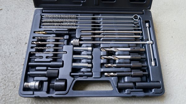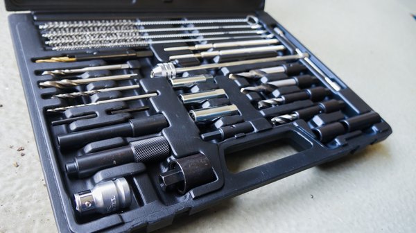 Aki bátor, úgyis nekiáll furkálni. Ehhez kap meg minden elképzelhető segítséget a kiskofferrel. Legyen M8-as, M9-es vagy M10-es a menet, benne vannak a tizedre tökéletes átmérőjű fúrók, csapok, menetfúrók, kihúzók. Én ehhez nem vagyok elég vakmerő, inkább kihagytam a vájármunkát, összekühedt izzítógyertya hiányában.
