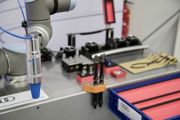 Szintén itt mutattak egy alvázburkolatot felcsavarozó állomást, amelyben négy robotkar emelte fel a csavarozókat a felette lógó padlólemez alá. A robotkarok darabja 23 ezer euró, viszont a Makita csavarbehajtó, amivel dolgoznak, nagyjából az Obiban beszerezhető, hiszen ez is ellátja a feladatot. Viszont az a fejlesztés, amitől kollektívan hanyatt estünk, egy nagyjából tizenkét centi hosszú, üreges szilikoncsőr volt. Nevezzük bármit megfogó gépnek, mert ez írja legjobban körbe a feladatát, hiszen bármit megfog. Tekintve, hogy a lambda-szonda vezetékétől kezdve a légbeömlő rostélyáig tényleg bármit fel kell tudnia emelni, komoly kihívás egy ilyen gép megtervezése. A Festo tervezői a természethez nyúltak az ihletért, ugyanis ennyire speciális feladatra például a kaméleon nyelve képes. Nézzék csak: