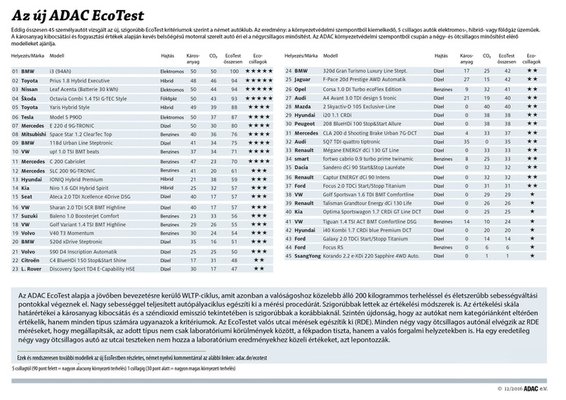Az abszolút győztes a BMW i3 lett, 94 Ah-ás változatban a maximális száz pontot és öt csillagot kapta az ADAC tesztelőitől. Ugyan a fogyasztása nagyobb, mint a gyárilag megadott 12,6 kWh/100 km, az ADAC EcoTest értéke 17,4 kWh; és a lokálisan zéró emisszió helyett a németeket a villanyautók esetében is számolnak CO<sub>2</sub> kibocsátással, ami az i3 esetén 101 g/km. Nem meglepő módon dobogós még a Toyota Prius 1.8 Hybrid, és a Nissan Leaf is, egyaránt 94 ponttal és öt csillaggal. A Leaf gyárilag megadott 15 kWh-ás fogyasztása helyett 20,5 kWh-át mértek a klub emberei és így 118 g/km-re számolták a széndioxid emisszióját – emiatt veszít pontokat. Az alternatív hajtások mellett szép eredmény érhető el alternatív üzemanyaggal is: a negyedik helyezett egy földgázos Skoda Octavia Combi 1.4 TSI. Ez 3,5 kg/100 km helyett 4,2 kilogramm gázt fogyasztott, így a CO<sub>2</sub> kibocsátása 122 g/km. A klasszikus benzinesek közül a legjobb eredményt a Mitubishi Space Star 1.2 érte el, eredménye egy nyolcadik helyezés. A dízelek közül csupán a már említett BMW 118d és a Mercedes E220 d 9G-Tronic tűnik meggyőzőnek, így négy-négy Eco-csillaggal övék a 9. és a 7. hely.