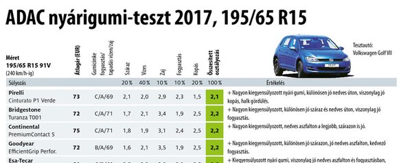 A kompakt kategória egyik jellemző méretében 16 gyártó abroncsait tesztelte az ADAC, amelyeket egy 7-es Golfra szereltek fel. Ezek közül öt kapta meg a nagyon jó minősítést. Az élen a Pirelli Cinturato P1 Verde végzett 2,1-es osztályzattal (a legjobb a 0,5, a legrosszabb az 5,5), mindössze egy tizeddel megelőzve a Bridgestone Turanza T001-et, a Continental PremiumContact 5-öt és a Goodyear EfficientGrip Performance-t. Jól szerepelt az itthon kevésbé ismert, de már tavaly is kiemelkedő eredménnyel záró Esa-Tecar Spirit 5 HP mintázata is – ez volt a legolcsóbb a maga 50 eurós darabonkénti árával. Általánosságban elmondható, hogy a zöld plecsnihez kiegyensúlyozott teljesítményre volt szükség, ezeknél a gumiknál gyengeséget nem jegyeztek fel a tesztelők.