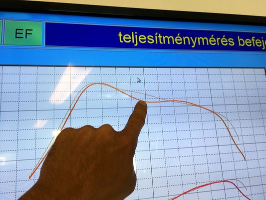 Hogy a motor és a töltőlevegő hűtő hőmérséklete ne szálljon el, a normál ventilátor mellé még egy kisebbet is beállított Péter. Jöhetett a második mérés és a kellemetlen meglepődés: bő egy lóerővel kevesebbet mértünk, ez nem a világ, de volt a nyomatékgörbében egy furcsa és erős beesés. Kis fejvakarás után arra jutottunk, csináljunk még egy mérést, úgy, hogy minden ventilátor maximumon pörög.
