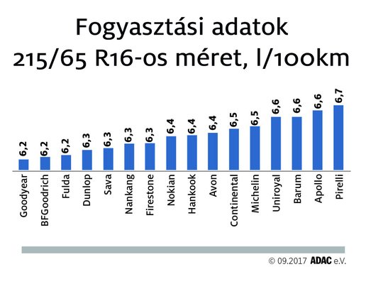 A 215/65 R16-os méretű kerekekről idén diagramot is készítettek, amely nem az osztályzatokat, hanem a száz kilométerre vetített tényleges üzemanyag-fogyasztást mutatja. Ebből jól látszik, hogy a Goodyear UltraGrip Performance Gen-1 és a BF Goodrich g-Force Winter 2 voltak a legtakarékosabbak: 6,2 litert evett velük a Tiguan. Fél literrel kevesebbet, mint a másik végletként szolgáló Pirellikkel.