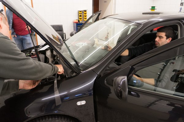 Közben, egy másik kolléga (Jocó) megkezdi a hozzáférést az autó motorvezérlő elektronikájához. Típusonként és márkánként változó, hogy ez mennyire megy könnyen, a Seatoknál általában kicsit nehezebb, mint a Volkswagen-konszern többi gyártmányának esetében. Ennél a konkrét Leonnál le kellett szedni az ablaktörlőlapátokat és az azt körülvevő műanyag konzolt is, hogy az új funkcióhoz szükséges vezetékben ne tehessen kárt az ablaktörlőmotor.