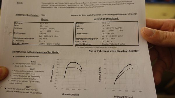 A fekete Avant quattro külön érdekessége, hogy korábban, Németországban az ABT cég módosította a motorvezérlő szoftverét, amikor még csak 40 ezer kilométernél járt. A beavatkozás minden dokumentációja mellékelve volt az autóhoz. Az elektronikát érintő tuninghoz tartozó leírás nem csak a várható teljesítményt (270 LE) és nyomatékot (550 Nm) adta meg, hanem felhívta a figyelmet a autó megfelelő karbantartásának fontosságára is.