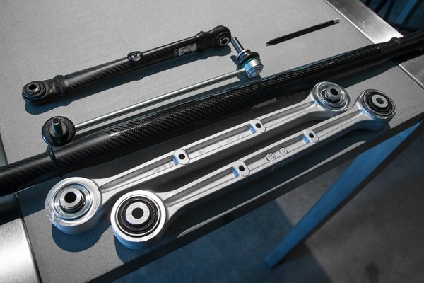 A Weissach csomag egyébként 28 kilót farag az 1430 kilós önsúlyból. Ehhez kellenek az említett magnéziumfelnik (-11,5 kg), a látszó karbon első és hátsó fedél, illetve hátsó szárny (-0,8 kg), de a stabrudak és azok kutyacsontjai is karbonból készülnek (-5,3 kg). Ilyenből pont volt ott mintapéldány – grammra nem tudom, mennyi lehet a súlyuk, de kábé olyan könnyűek, mint az egér, amit a gép mellett tologatok. Az alapmodellnél magnéziumból készül a tető, ezt a Weissach-csomagnál karbonra cserélik (-0,5 kg).