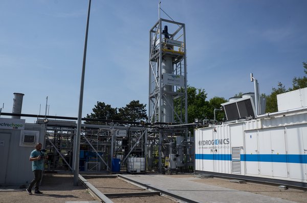 Ezért már Dániáig kellett vezetnünk, a 18 kilométer hosszú Nagy-Bælt hídon keresztül a Koppenhága melletti BioCat üzemig. A BioCat egy kísérleti üzem, ami elektrolízissel állít elő hidrogént. Ez még talán nem is nagy újdonság, a világ számos pontján próbálkoznak már hasonlóval, de a BioCatben a mobilizálhatóság, a gyors felépítési lehetőség és a széleskörű felhasználás a különlegesség.