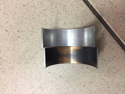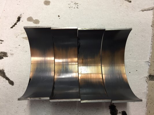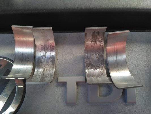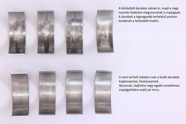 A saját motoromból kiszerelt csapágyak azonban speciális kopásképet mutatnak. A felületből hiányoznak darabok, ahol pedig nincs hiány, ott látható ugyakopásn, de teljesen normál mértékű. További érdekesség, hogy a csapágy nem terhelt oldalán szinte nincs kopás, ezért a kenéshiány, olajnyomás hiánya, esetleg a szennyeződés az olajban kizárható. A nem terhelt oldalon lévő húzásnyomokat a terhelt oldalból kiváló részecskék okozták, ezt hívják abrazív kopásnyomoknak.