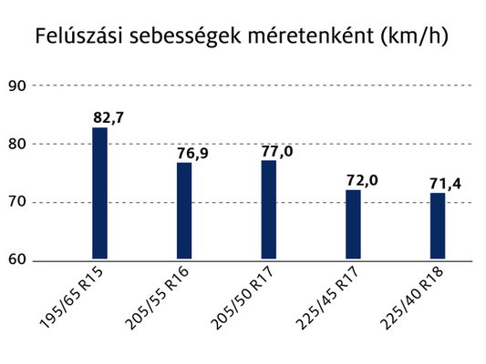 Érdemes külön megnézni a vízen való felúszást, vagyis az aquaplaningot. A teszt során azt vizsgálták, hogy hét milliméteres vízfelületre hajtva mekkora sebességnél veszti el a gumi az aszfalttal való kapcsolatot. A lenti táblázatból jól látszik: a legszélesebb és a legkeskenyebb között több mint tíz kilométer per órás különbség van ebben a tekintetben - a keskenyebb javára. A keskenyebb gumik olyan tulajdonságokban is jobban szerepeltek az aquaplaning mellett, mint a havon való elindulás, vagy körpályán az oldalvezető képesség.