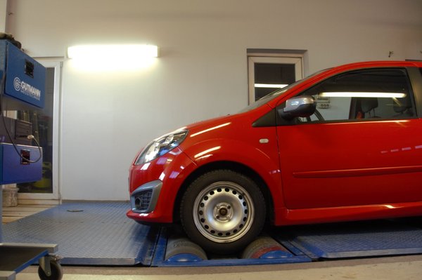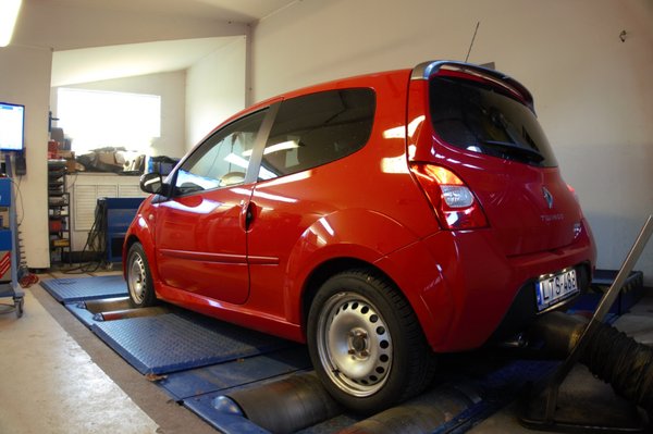 Mi arra voltunk kíváncsiak, hogy a szlalomversenyen nevelkedett kis piros Twingo mit tud a teljesítménymérő padon. Az autó teljesen szériaállapotú, eltekintve az acélfelnikre szerelt téli gumiktól és a kiegészítőműszerektől, melyek az olajnyomást- és hőfokot mutatják, ami sportos használatkor jól jön.