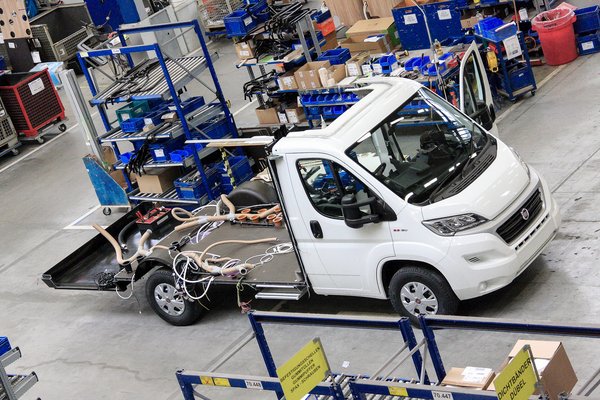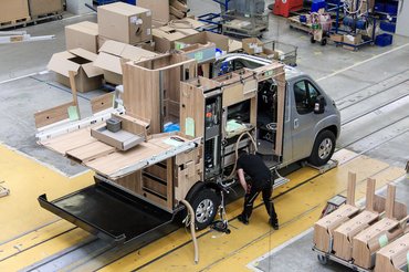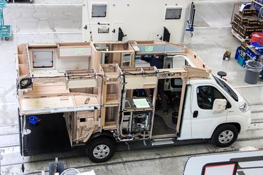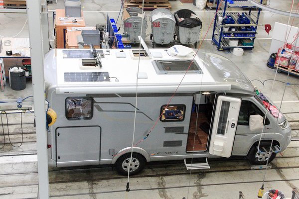 A gyártósoron szigeteket képeztek, ahol egyes elemeket előkészítése és részleges komplettírozása folyik, így beszélhetünk konyhát, fürdőt és nappalit szerelő részlegről, valamint a műszaki dolgokat berakó munkaegységekről. A szigetek között, szállítószalagon haladó autóba bekerülnek ezek az egységek, a végén pedig ráteszik a külső falakat és a tetőt. Pont fordítva, mint gondolná az ember, ráadásul az integrált modellből a fentről lehúzható 180x200-as ágy csak a szélvédőn fér be, utána teszik bele a szélvédőt, szinte az utolsó fázisként.