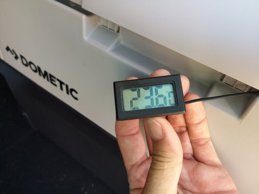 A kérdés, hogy ha megállunk, és magára hagyjuk a hűtőládát egy teljesen feltöltött, szintén Dometic PLB40 hordozható lítium akksival, mi lesz, amikor visszatérünk órák múlva?