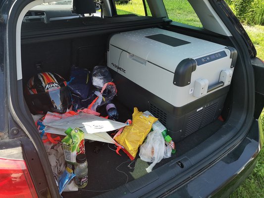 A beépített hőmérőben nem hiszek. Belógattam egy saját hőmérőt, 23 fokról indultunk a fokozatosan melegedő szombat délutánba, a hűtőben is 23 fok volt, amikor beraktunk 3 ásványvizet és két doboz sört. Meg valami üdítőt és pár egyebet. Ezek egyike sem volt hűtve, nagyjából ezek is 23 fokosak voltak, a nagy hőkapacitású folyadékok lehűtése is energiaigényes. Az autó csomagtartójába tettük a ládát, a Golf Variant csomagtartójának felét elfoglalja, szivargyújtóval bekötöttük, indulás.