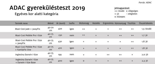Az egyéves kor alatt használatos termékek közül mindegyik jól teljesített. A legkiemelkedőbb a Maxi-Cosi Jade + 3wayFix lett, azonban ár-érték arányban a Maxi-Cosi Pebble Pro i-Size talán még jobb választás. Valamivel több mint feleannyiba kerül, mint a tesztgyőztes, de minden részpontja kiváló vagy jó. Igaz, nem isofixes.
