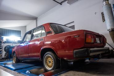 A vértuning, tüzet okádó sárkányokat a műsor indulásakor ki akartuk zárni az Erőmérőből, mert nem akartunk vitát, hogy ki miatt robbant szét egy motor a mérés közben és ki fizeti az Autokorbel falainak újrafestését. Ez azonban nem egy klasszikus értelemben vett, szétfaragott tuning motor, csupán egy kicsit okosabban összerakott, gyári 1600 köbcentis, láncos Lada motor. Persze nem azt mondom, hogy szöggyári, de egy vezérműtengely, egy kiegyensúlyozott, kigrammolt forgattyús mechanizmus, lekönnyített lendkerék és jobb minőségű dugattyúk növelt kompresszióval még nem a szétfaragás és kihegyezés ismérvei.