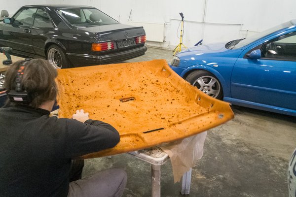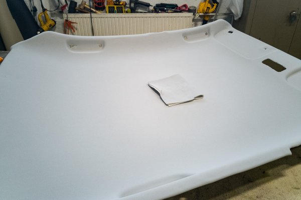 A szakadt tetőkárpit kiemelése után lehántják a szövetet és az alatta maradt morzsalékos szivacsréteget eltávolítják a tálcáról. Körülbelül fél órányi pucolás után ismét Zoltán asztalán a pőre tálca, így előkerül a generációkon át öröklődött, fejméretű szabóolló is. A tetőt burkoló anyag egyik oldala a szivacs, másik oldalán a színhelyes szövet. Ez az anyag némi méretre vágás után szórópisztollyal vékony ragasztóréteget kap. Én éppen csak kezdek szédelegni a ragasztó szagától, mire a kárpit már szinte olyan, mint új korában.