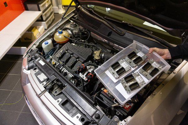 Zoli hangsúlyozza, hogy nem a Fiatokat akarja ekézni, egyszerűen csak a tapasztalat ezt mutatja. Az eladótérben áll is egy körbeműanyagozott, ültetett Stilo, egy 1,6-os benzines. Ha megcsinálják az elektronikáját, még mindig kiderülhet, hogy rossz a fojtószelep, a kábelköteg, a gyújtótrafó, az immobiliser, a komfortelektronikája, vagy bármi. Ez az autó a cégé, meg kellett venni, mert Zoli szerint csak így lehet elég hatékony a minőségbiztosítás. Sokszor már a munkafelvétel után ide kerül a javításra szánt darab, diagnosztikai jelleggel, a javítás elvégzése után pedig mindenképp rádugják a kész elektronikát. Zoliék sem tévedhetetlenek, ötvenből egy vezérlőt benéznek, egy ilyen teszt csak javítja az arányt. Az autó nem megy sehova, járatják, emiatt van egy üzemóra-számláló motortérben, hogy tudják, mikor kell olajat cserélni.