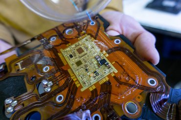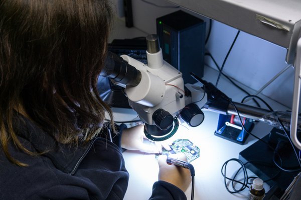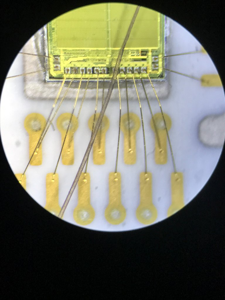 A műhelyben képesek javítani hibridnek nevezett, beöntött áramköröket is, ezek azok az áramkörök, amiken egy szilikonalapú, puha, zselés réteg védi az alkatrészeket. Egy hagyományos áramkörön a csipek fekete tokozást kapnak, kiáll belőlük sok kis láb, mindenki látott már ilyet. Viszont az a probléma, hogy a kis fekete soklábú csipet gyártani drága, hiszen egy 20 forintosnyi elemben alig félkörömnyi az elektronika, a többi a kivezetés és a tok. Egy szilikonnal beöntött áramkörben ez lényegesen egyszerűbb, cserébe javítani nehezebb. A lenti képen jól látszik, hogy mekkora vezeték jön ki magából a csipből, a képen a keresztbe futó fekete vonal egy emberi hajszál. Zoliék ezt is tudják javítani, a zselét egy speciális oldószerrel oldják le, ami a szilikont eltünteti, de az áramkört nem károsítja. Ez még a javítás kevésbé bonyolult része.