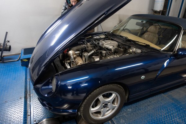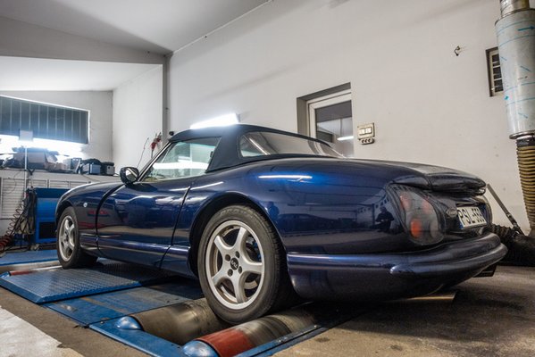 Le is kellett kicsit súlyoznunk a TVR-t a mérőpadon, mert könnyű hátuljának és az erős motorjának köszönhetően nem tapadt meg eléggé a görgőkön a két hátsó hajtott kerék.