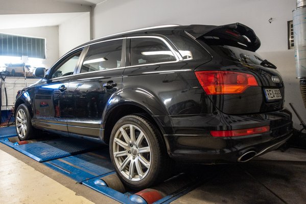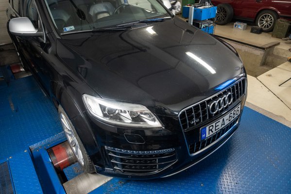 Nagyon vártuk ezt a mérést. Ekkora nyomatékú autó még nem szerepelt az Erőmérőben, azonban biztosak voltunk benne, hogy az erőt le tudja tenni a quattro-hajtása révén. Már a beállásnál is furcsa volt viszont technikusunk, Némethi Péter számára a Q7 viselkedése, mert nem a szokásos quattro-módon reagált a melegítés során. Aszimmetrikusan osztotta el a nyomatékot, inkább a hátsó tengelyt hajtotta, az elsőt alig, ráadásul mintha fékezte is volna az első kerekeket.