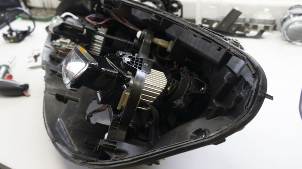 „Az autólámpa-felújítás olyan dolog, amit ha rendesen csinálunk, várható, hogy javítás közben elég sok problémába bele fogunk ütközni. Például a kábelek szigetelésének elöregedése, ami akár zárlatot vagy nagyobb bajt is okozhat. 2004-2010-ig rengeteg ilyen probléma van. Ilyen Mercedes W222-lámpát egyébként még nem sokan láttak itthon kiszerelve. Ez kitakarja a szembejövőt is, ami összességében szerintem oltári nagy baromság, de legalább mindig lesz munkánk.” – meséli mosolyogva László, és elég ránéznem a szétbelezett lámpatestre, hogy igazat adjak neki. LED-ek, parabolatükrök, ventilátorok és még egy halom egyéb elektronika van belezsúfolva egy ilyen házba. Szükség is van a hűtésre, hiszen a nagy fényerejű fénydiódák a közhiedelemmel ellentétben ugyanúgy termelnek hőt, mint a halogén- vagy a xenonizzók, csak másképpen. Biztosan te is tapasztaltad már, hogy ledes fényforrásokról mindig vibráló videofelvételek készülnek – na itt van a kutya elásva.
