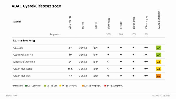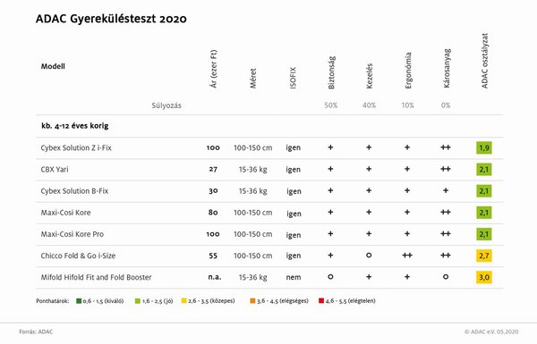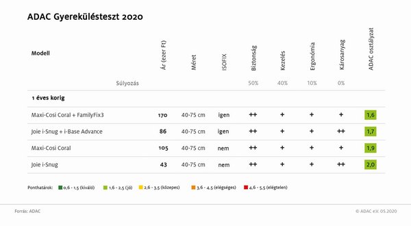 Az ADAC tesztjében szereplő gyerekülések döntő többsége Magyarországon is kapható. Az alábbi táblázatokban már a hazai árak szerepelnek, igaz, tájékoztató jelleggel, hiszen nagy a szórás. Van ugyanakkor néhány olyan termék, amelyet hazánkban nem forgalmaznak.