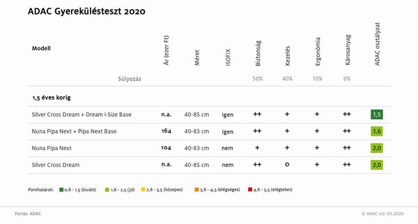 A másfél éves korig, vagyis általában 40-85 centiméteres intervallumban használható ülések már egy picivel hosszabb távra jelentenek megoldást a családoknak. Itt sem volt olyan termék, amely számottevően lemaradt volna a többiektől, jól látszik, hogy a táblázatban szintén minden sor végén zöld a pontszám. Viszont a Silver Cross Dream + Dream i-Size Base fölfelé lógott ki a sorból: 1,5-ös osztályzatával ez lett az idei ADAC-teszt egyetlen kiválóra minősített ülése.