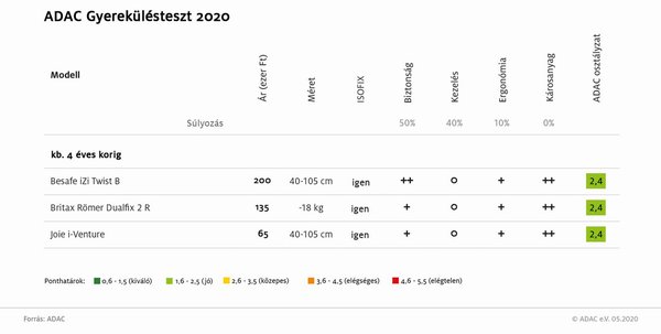 A négyéves korig használható gyermekbiztonsági rendszerek esetében 40-105 centiméter a határ, de van olyan termék, ahol testsúlyt adtak meg: 18 kilogrammot. Itt mindhárom ülés egyformán 2,4-es osztályzatot kapott, vagyis jó eredménnyel vizsgáztak. Ha mégis különbséget kellene tenni, akkor a Besafe iZi Twist B kívánkozik a sor elejére, hiszen annál találjuk a legjobb értéket a biztonság oszlopban.